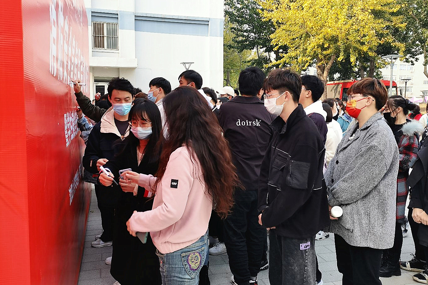 全体参会人员在消防安全宣传月启动仪式背板上签名